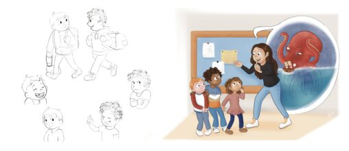 Holdi and Pepe | Beware of the giant octopus! – Sketches and vignette for a book project, digital illustration, 2025