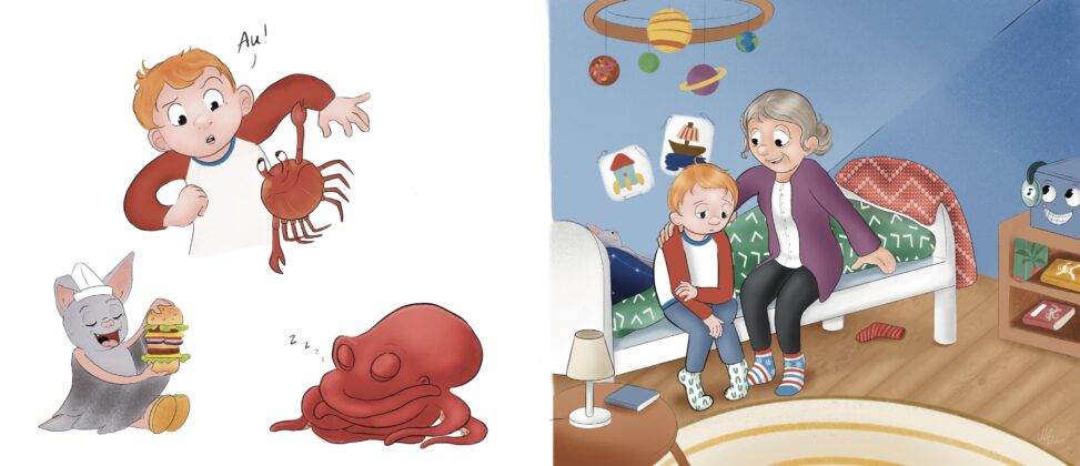 Animal companions | Grandma knows what to do – Spots and full page illustration for a book project, digital illustration, 2025